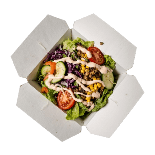 Mix sałat, pierś z kurczaka, oliwki, kukurydza, pomidor, cebula czerwona, sos czosnkowy