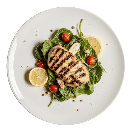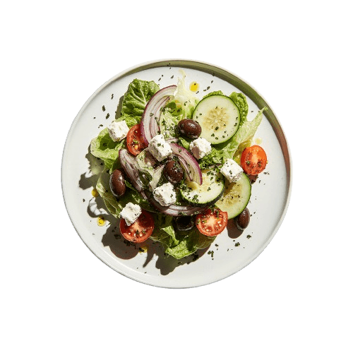 Mix sałat, pierś z kurczaka, pomidor, ogórek, oliwki, sos czosnkowy
