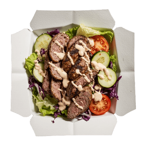 Mix sałat, mięso gyros, ogórek, pomidor, sos czosnkowy i meksykański